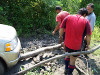 Ni dos kilometros mas alla, de pronto, sentimos que el carro se quedó en el lodo, sus llantas grandes y traccion 4x4 debian ser la facil solucion, asi que no perdimos la calma, aun. En ese momento estabamos con el carro: el dueño Carlos, el chofer Oscar, un ciclista Paul, otro ciclista Julio, mi novia y yo. Tratamos de empujar el carro, luego de levantarle un poco con unos troncos, luego con pala en mano cavar un poco el barro para que pudiera moverse el carro. (Para esto ya era la una de la tarde y el sol pegaba muy fuerte).